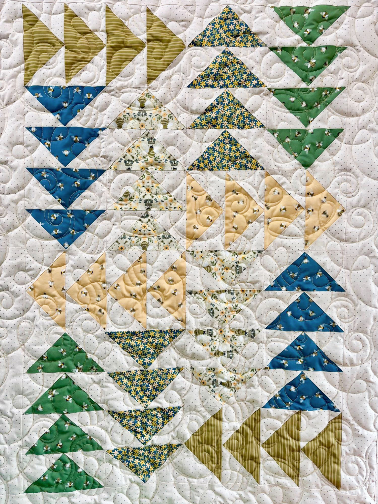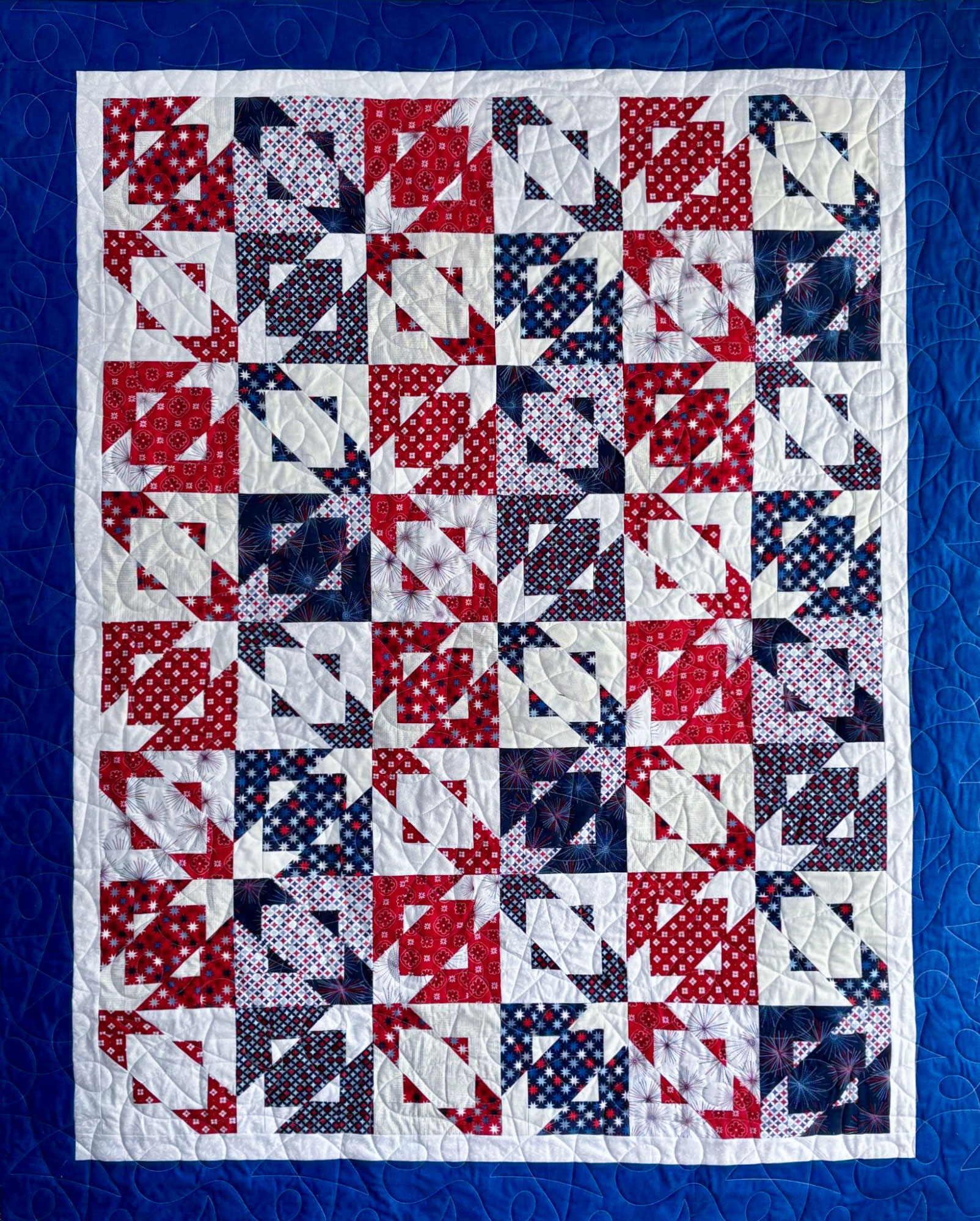 10” square pattern to make crib to king size quilts. Learn the secret to the floating triangles without difficult piecing!